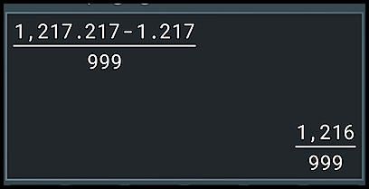 | 3. Subtract the 2nd equation from the first. All digits after the after the decimal point cancel out. | 999x = 1216. |
