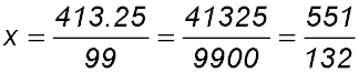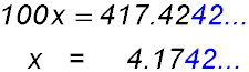 | 3. Subtract the 2nd equation from the first. All digits after the 2nd number after the decimal point cancel out. | 99x = 413.25 |