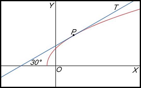 20. The graph of has a tangent T as shown in the diagram. The tangent makes an angle of 30° with the x axis as shown and its equation can be expressed as y = mx + x.