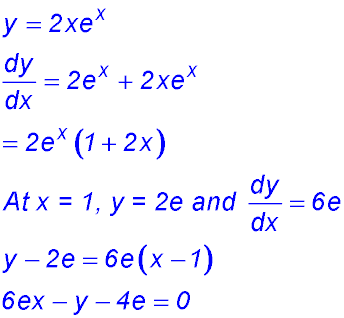 26. Find the equation of the tangent to the curve y = 2x ex at the point where x = 1.