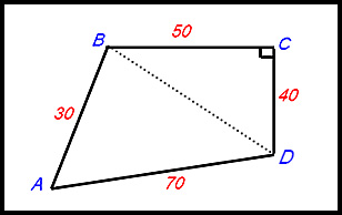 The diagram to the left shows a quadrilateral ABCD. There is a right angle at angle C. The length of each side is indicated in red.