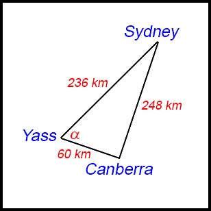 Through what angle (α) (to the nearest degree) must the pilot turn, while over Yass, to head towards Canberra?